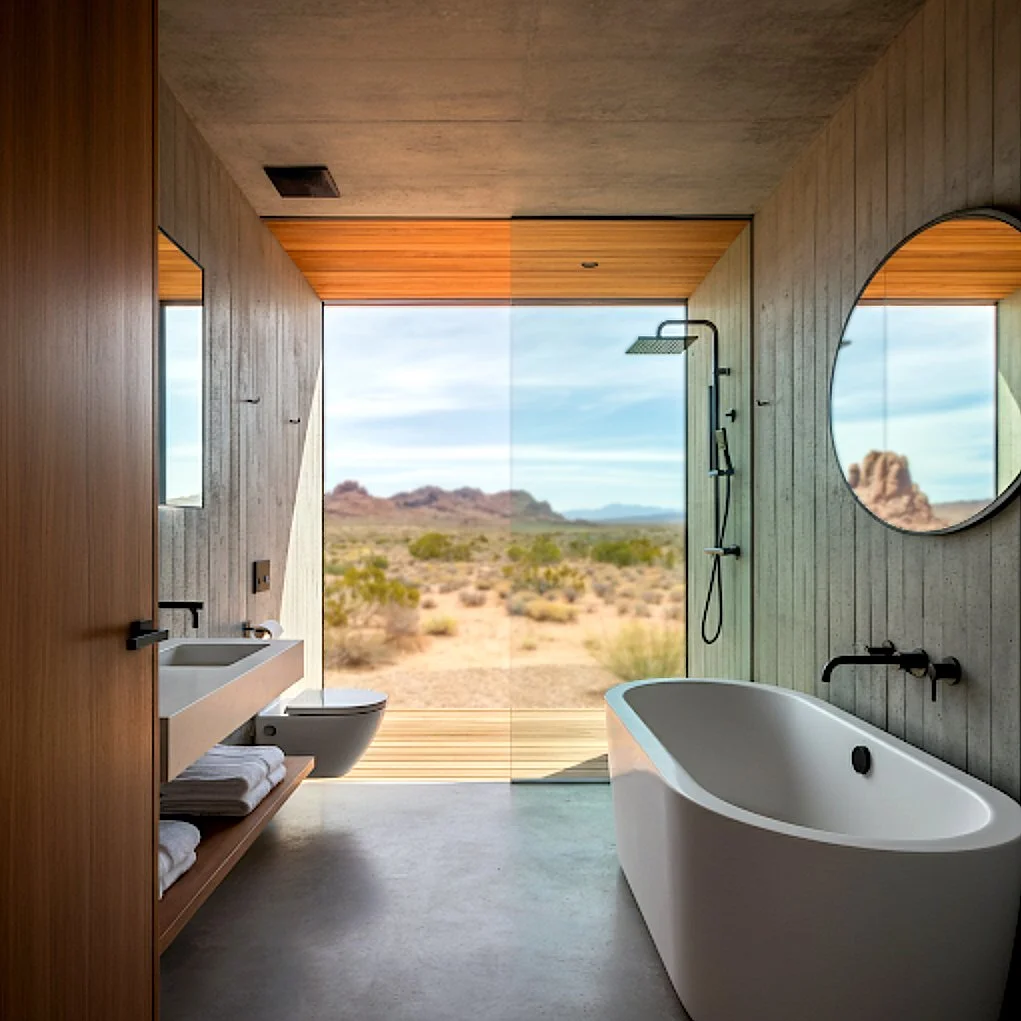 The Desert Hot Springs Retreat is a visionary concept developed through the collaboration of WRYHTA ARCHITECTS and AI technology. These visuals present a bold interpretation of design, seamlessly merging aesthetics and practicality. This project stands as a catalyst for creative thinking, encouraging new perspectives on innovative architectural solutions.